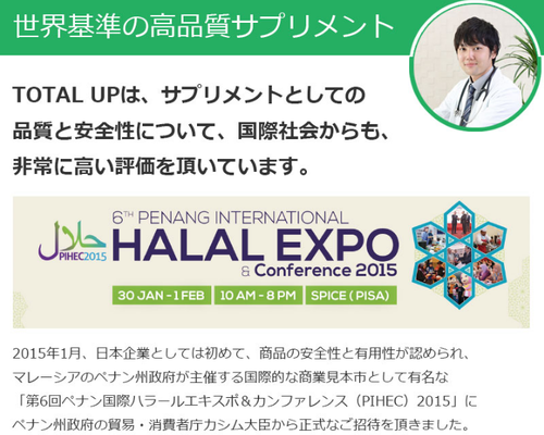 2015年には、食品や化粧品の安全性を認められた商品の国際的な見本市『ハラールエキスポ2015(マレーシア・ペナン州)』に、ペナン州のカシム大臣からご招待を頂き、弊社製品の安全性・有用性を表彰されました。