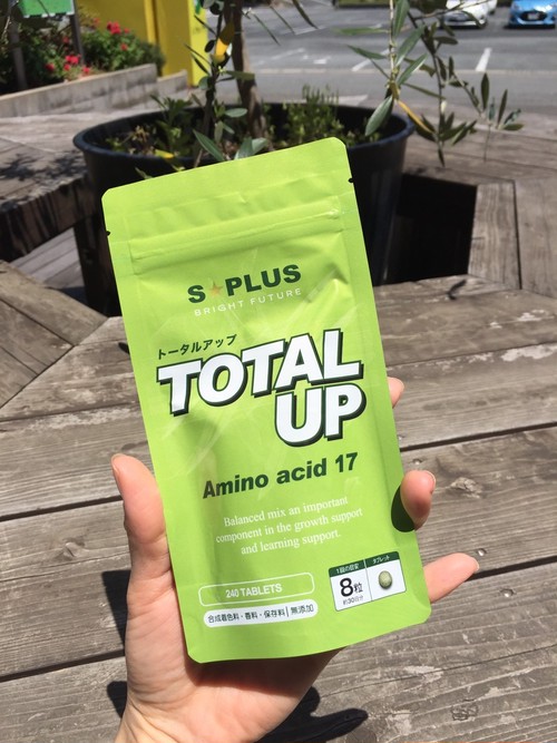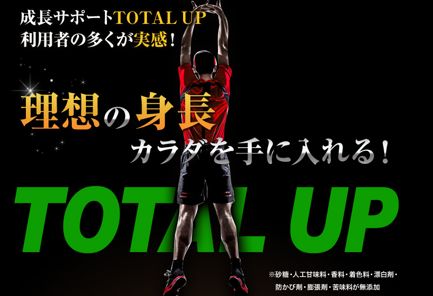 トータルアップ(TOTAL UP)は、成長に必要なアミノ酸、WHOにもその栄養価の有用性を認められたスピルリナ、骨を伸ばすために必要なビタミン・ミネラルをバランス良く配合した、成長サポートサプリメントです。